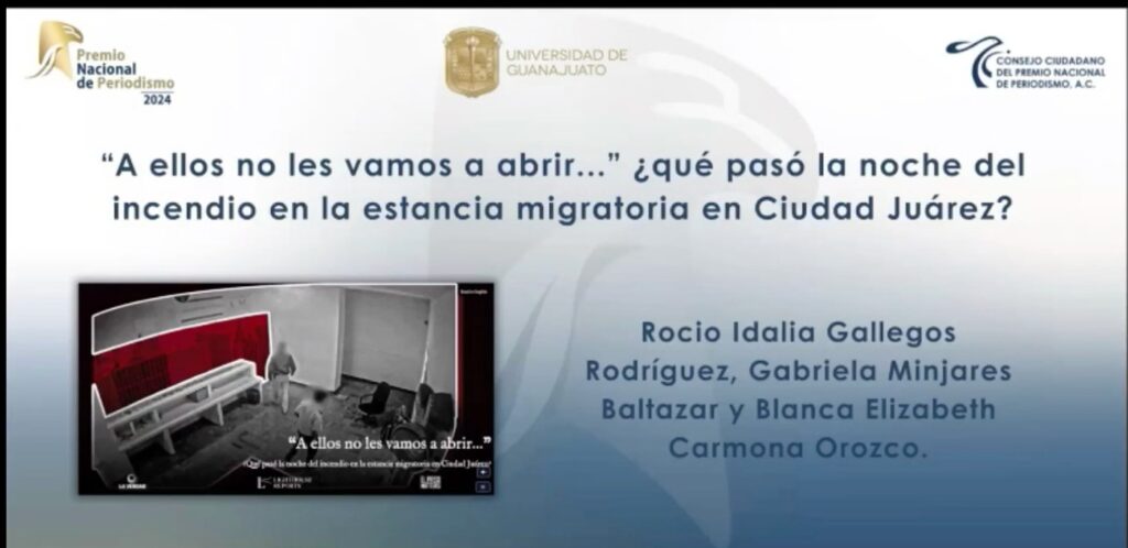 En la categoría de Reportaje, el premio es para “A ellos no les vamos a abrir…” ¿Qué pasó la noche del incendio en la estancia migratoria en Ciudad Juárez?, publicado por La Verdad Juárez con la autoría de Rocío Gallegos, Gabriela Minjares y Blanca Carmona, quienes documentaron y evidenciaron las fallas en los protocolos de detención, la ausencia de medidas de evacuación, puertas bloqueadas y posibles omisiones del personal durante la noche del 27 de marzo de 2023, cuando en la celda masculina de la estación migratoria del Instituto Nacional de Migración (INM) en Ciudad Juárez, Chihuahua, murieron al menos 40 personas migrantes y otras 27 más resultaron heridas. Las autoridades aseguraron que el incendio fue iniciado como protesta con colchonetas incendiadas, pero esto fue solamente un fragmento de las negligencias del Estado.
