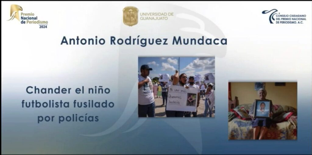 Se trata de Chander, el niño futbolista fusilado por policías, una crónica realizada por Antonio Rodríguez Mundaca con fotografías de Karen Rojas Kauffmann para El Muro MX, en la cual relata cómo Chander, futbolista de 16 años, fue asesinado por policías en Oaxaca. El trabajo exhibe un patrón de abusos, como una emboscada disfrazada de enfrentamiento, años de impunidad y sólo una persona condenada. Los periodistas lograron revelar cómo la violencia policial destruye vidas y erosiona la confianza comunitaria.